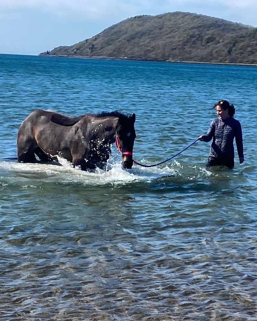 Jo runs a working family croft locally which is home to her horses who love swimming too.